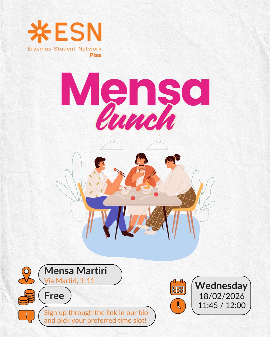IMPORTANT: You MUST arrive on time to get the free meal. Don't be late!