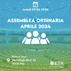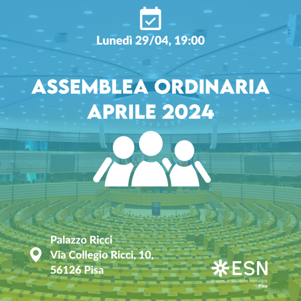 Si convoca ufficialmente l’Assemblea Ordinaria di Aprile che si svolgerà in prima convocazione in data 28/04/2024 alle ore 23.00 presso Piazza Martiri della Libertà, 6 e in seconda convocazione in data 29/04/2024 alle ore 19.00 presso l'aula R4 di Palazzo Ricci in via Collegio Ricci, 10, 56126 Pisa (PI).