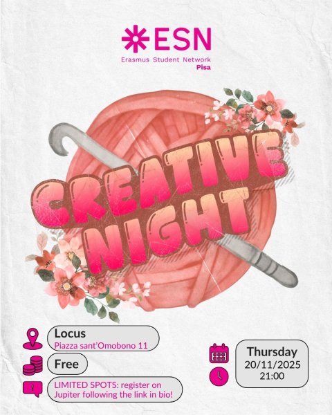 Join us for an evening dedicated to creativity in all its forms! The Club dell’Uncinetto will be there to guide anyone who wants to learn how to crochet, but ALL kinds of art are welcome: drawing, writing, painting, crafting, or anything else you love to make.
