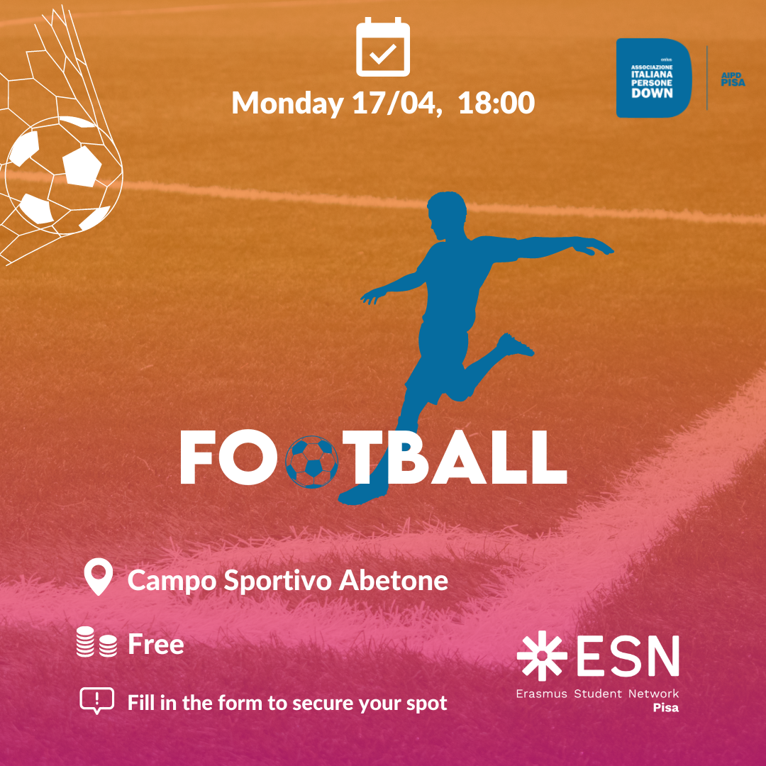 On Monday 17th there will be a football match with AIPD (Italian Association of People with Down Syndrome) Pisa and A.S.D. Freccia Azzurra. We need you to form a team! First, we will play against them, then we will probably make mixed teams