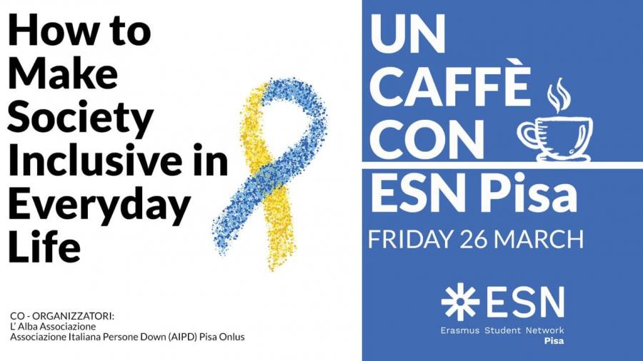 Conosci delle persone che hanno la sindrome di down o un disagio psichico? Vuoi sensibilizzarti sull’argomento? Ti invitiamo a metterti comodo e a prenderti Un Caffe con ESN Pisa per incontrare persone che ne sanno di piu e imparare qualcosa su come rendere la societa piu inclusiva. I nostri ospiti per questo evento saranno: